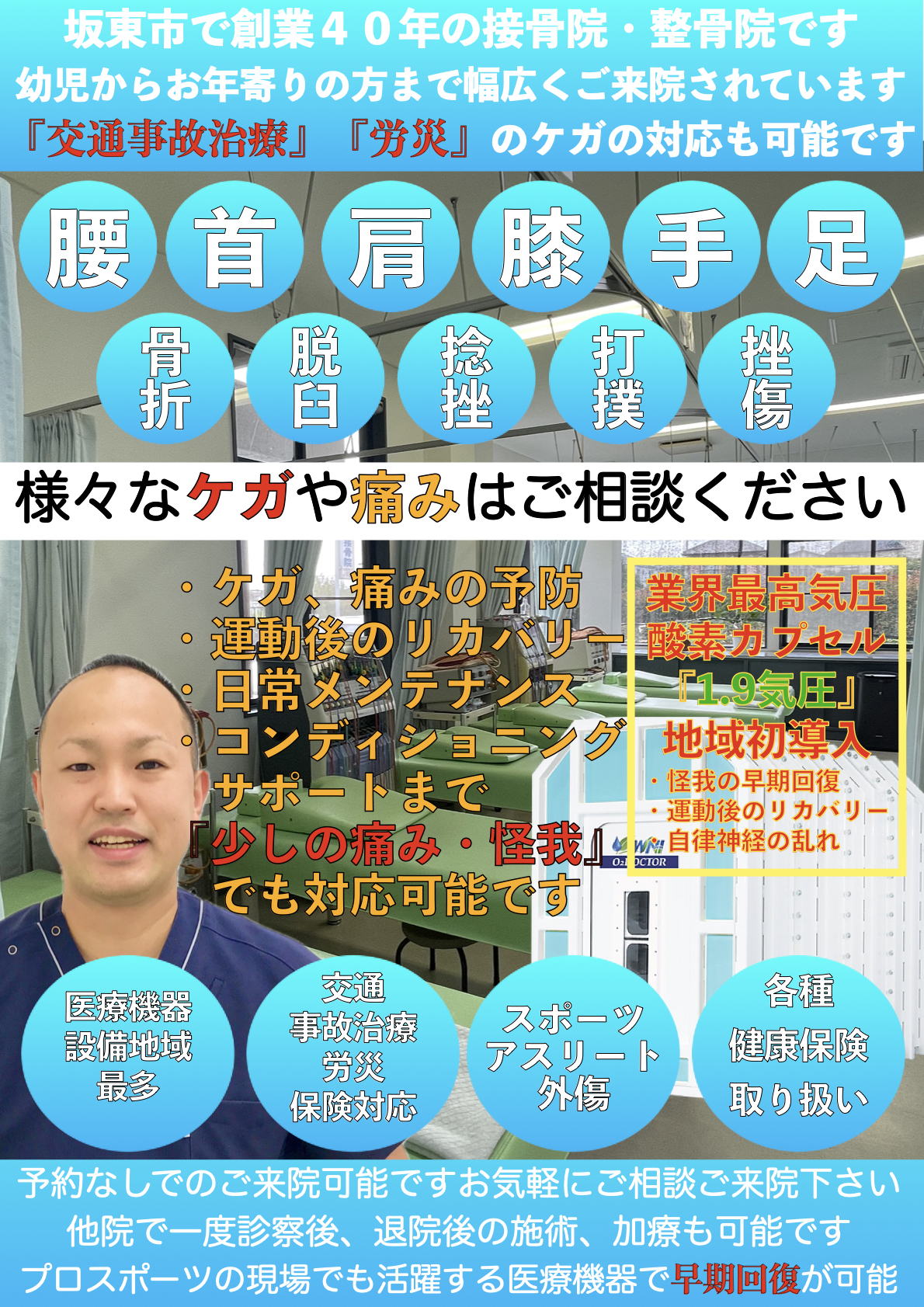 当院は幼児の脱臼(肘内障)や怪我から小学生、中学生、高校生のスポーツ障害や怪我、高齢の方の痛みや怪我等、様々なサポートが可能です。